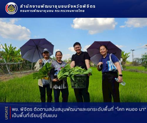 วันที่ 4 กุมภาพันธ์ 2569 นางสาวพันสี คุณธรรม พัฒนาการจังหวัดพิจิตร ได้มอบหมายนางเพียงใจ ยาดี ผู้อำนวยการกลุ่มงานยุทธศาสตร์การพัฒนาชุมชน พร้อมด้วยทีมวิชาการ ติดตาม สนับสนุนแปลง โคก หนอง นา ตามโครงการ "พัฒนาพื้นที่เรียนรู้รูปแบบโคก หนอง นา ตามศาสตร์พระราชา" ซึ่งได้รับสนับสนุนงบประมาณจากจังหวัดพิจิตรปี 2569 ณ แปลงพื้นที่เรียนรู้ โคก หนอง นา อำเภอดงเจริญ และอำเภอทับคล้อ โดยมีเป้าหมายเพื่อพัฒนาและยกระดับเป็นพื้นที่เรียนรู้ต้นแบบ ที่มีขีดความสามารถในการส่งเสริมการเรียนรู้ของประชาชน รวมไปถึงการขยายผลองค์ความรู้ไปสู่ประชาชนโดยรอบแปลงพื้นที่และบุคคลที่สนใจสามารถนำองค์ความรู้ที่ได้รับจากแปลงฯ ไปเป็นต้นแบบการใช้ชีวิต ส่งผลให้เกิดการสร้างงาน สร้างอาชีพ สร้างรายได้และมีคุณภาพชีวิตที่ดีขึ้น